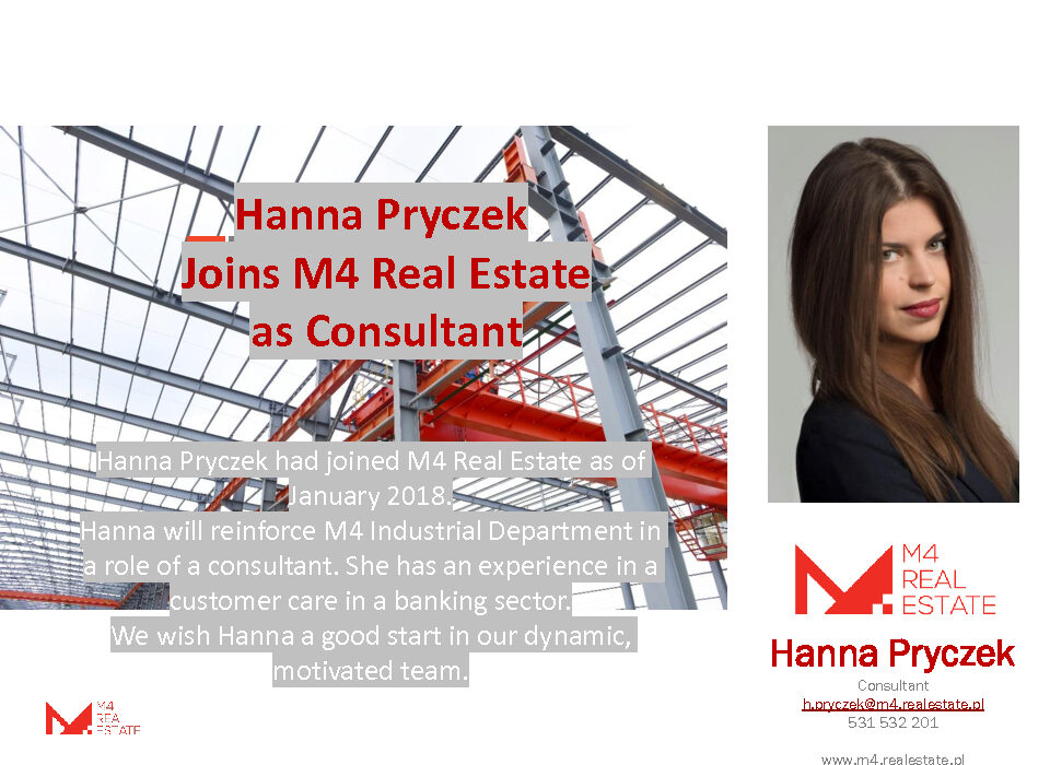 Hanna Pryczek dołączyła do zespołu M4 Real Estate od stycznia 2018 w roli Konsultanta w dziale Industrial. Hania zdobywała doświadczenie w sektorze bankowym.nnHanna Pryczek had joined M4 Real Estate as of January 2018. Hanna will reinforce M4 Industrial Department in a role of a Consultant. She han an experience in a banking sector.