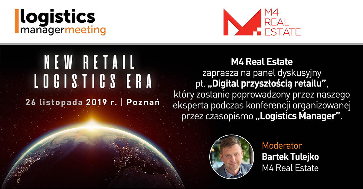 M4 Real Estate zaprasza na panel dyskusyjny, który odbędzie się 26 listopada 2019 w Poznaniu pt. „Digital przyszłością retailu”.rnrnPanel zostanie przeprowadzony przez naszego eksperta podczas konferencji organizowanej przez czasopismo „Logistics Manager”.rnrn